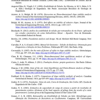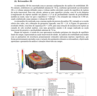 Por este motivo, o presente trabalho busca comparar os resultados de análises bi e tridimensionais a partir de um estudo de caso com retroanálises em um talude rompido. As análises foram executadas com o programa SVSlope, da SoilVision Systems Ltd., pelo método de equilíbrio limite de Morgenstern e Price (1965), adotando-se o critério de ruptura de Mohr-Coulomb para quantificação dos parâmetros de resistência dos solos. Preliminarmente, apresenta-se uma extensa revisão sobre análises e retroanálises 2D e 3D, com a experiência de diferentes autores. Posteriormente, procedeu-se às análises do caso estudado. Os resultados indicaram que foram obtidas superfícies de ruptura compatíveis com a situação de campo para ambas as análises (2D e 3D), com uma diferença pequena do plano de ruptura, e com fatores de segurança inferiores nas análises bidimensionais. Nas retroanálises, foram estimados parâmetros de resistência distintos para as análises 2D e 3D, para se obter resultados análogos, sendo que a retroanálise 3D forneceu valores de coesão do solo inferiores aos da retroanálise 2D.